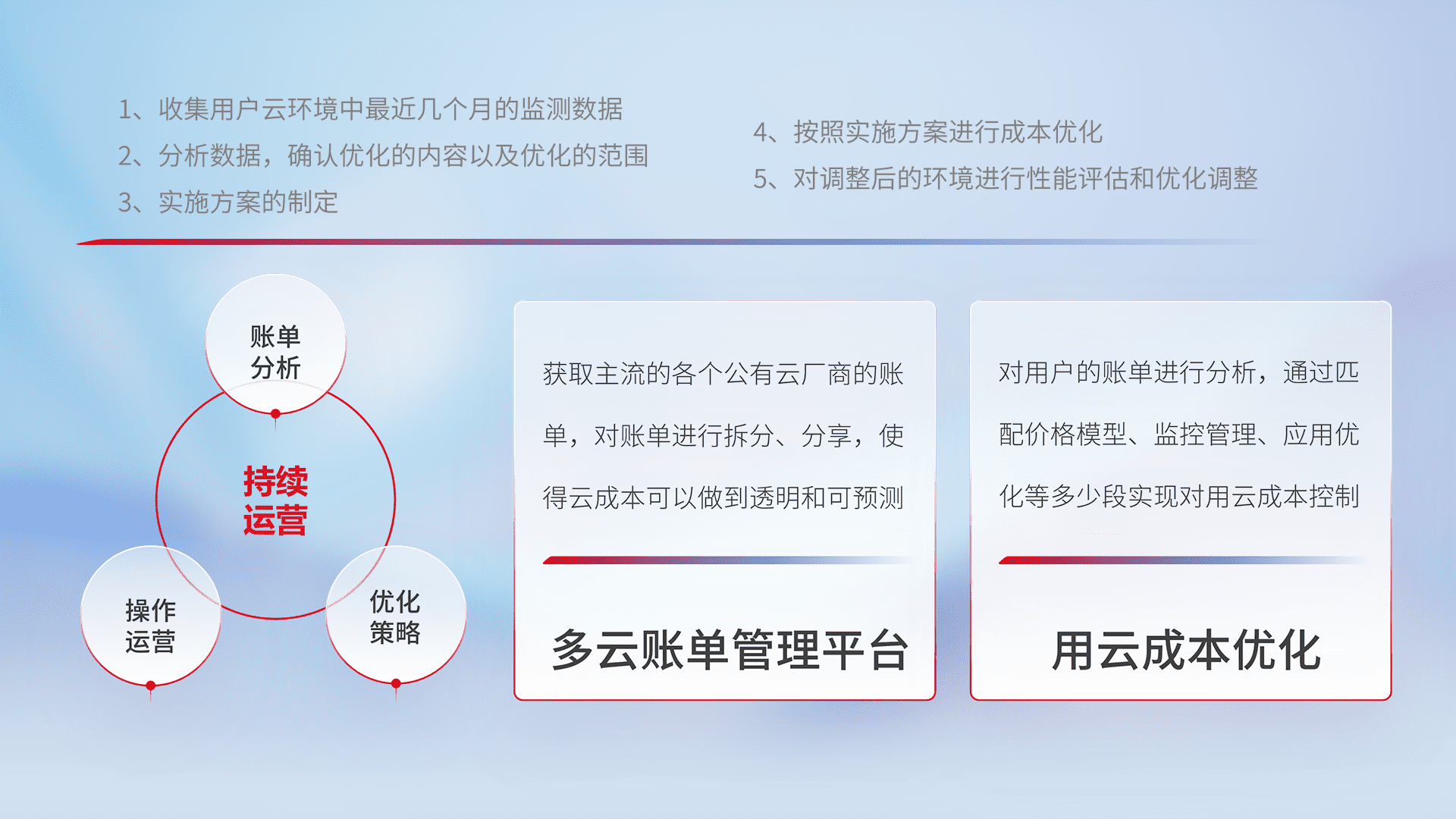 通过多云纳管,,,以统一的资源数据模型把客户的云资源进行抽象和封装,,,,进而实现对多云资源的统一操作,,,保障云资源管理的可靠性、、稳定性与可用性。。。。量身定制化运维内容,,,配置、、、开发运维、、、补丁管理、、、、备份、、、、监控、、、认证和访问管理、、、审计和日常巡检等,,,,保障在用云过程中的可靠度,,,,稳定度以及高可用率。。。